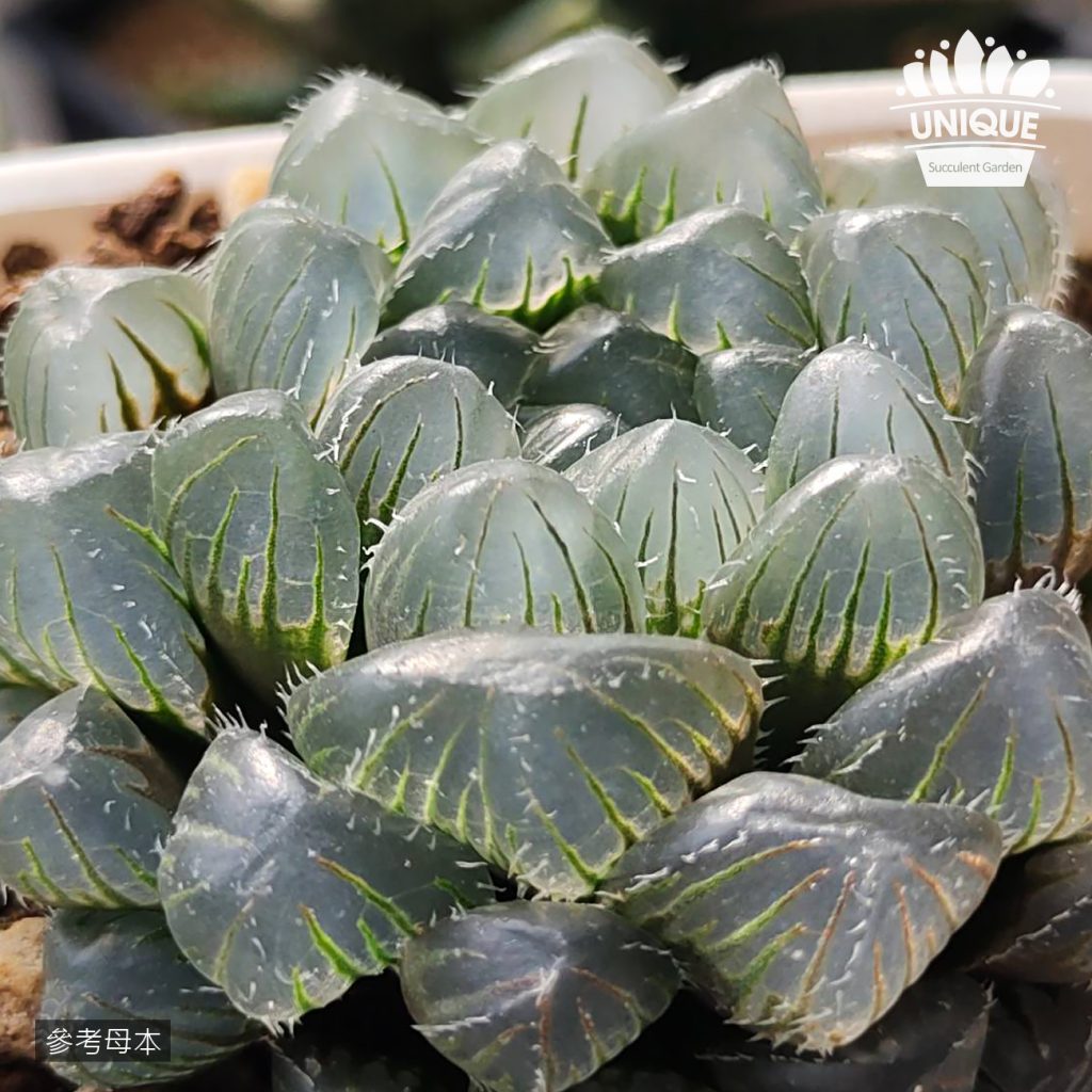 • 本植株為玉露交種實生,母本是冰燈玉露,子代葉型較尖、葉窗脈紋也更深。
