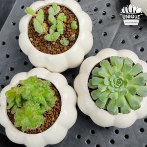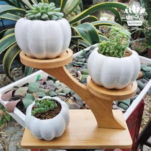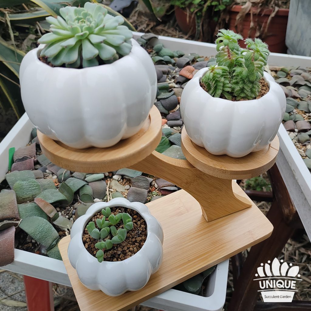 • 南瓜造型瓷盆,搭配木質底座,種植 碧魚蓮、萊恩小精靈、毛海星 3款景天。