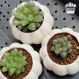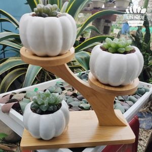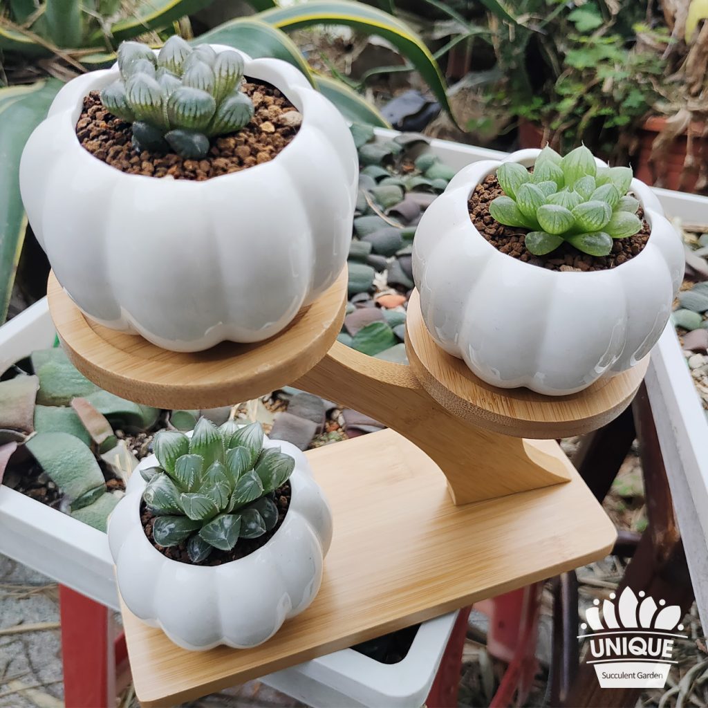 • 南瓜造型瓷盆,搭配木質底座,種植 日系玉露、巨大赤線、多德森 3款玉露。